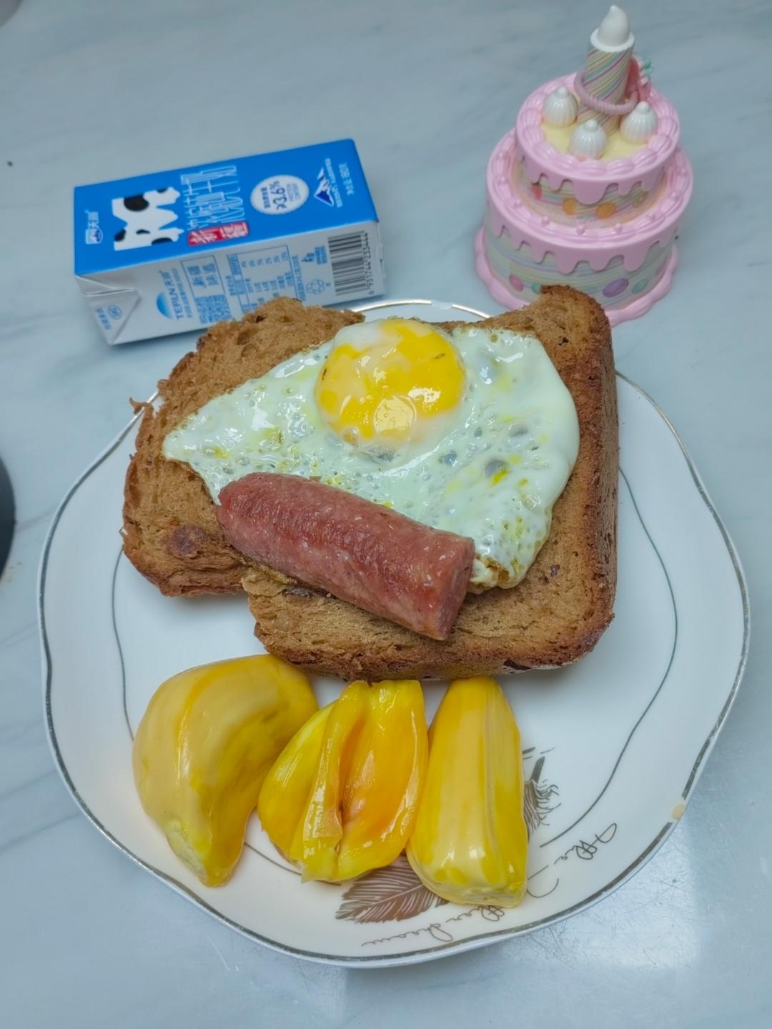 这个自制红枣红糖核桃面包太好吃了。煎个鸡蛋,煎个火腿,搭配一点菠萝蜜,太好吃了。连着吃了两天了。