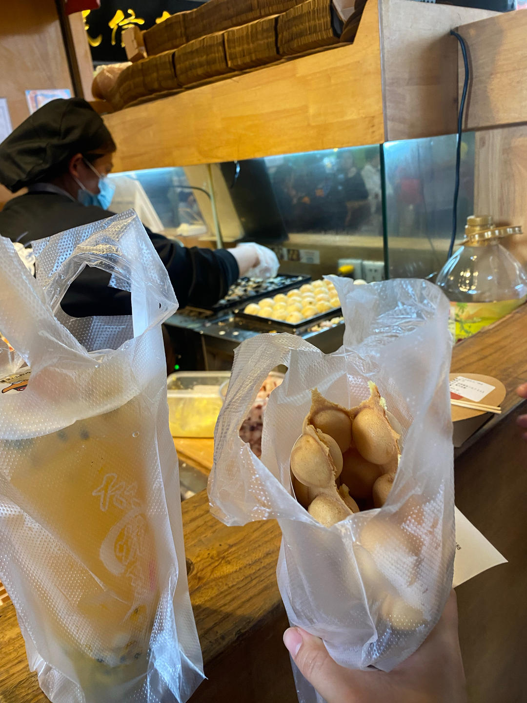 鸡蛋仔吃了一半 百香果茶喝了三分之一 剩下的给老公 偶尔满足一下哈哈