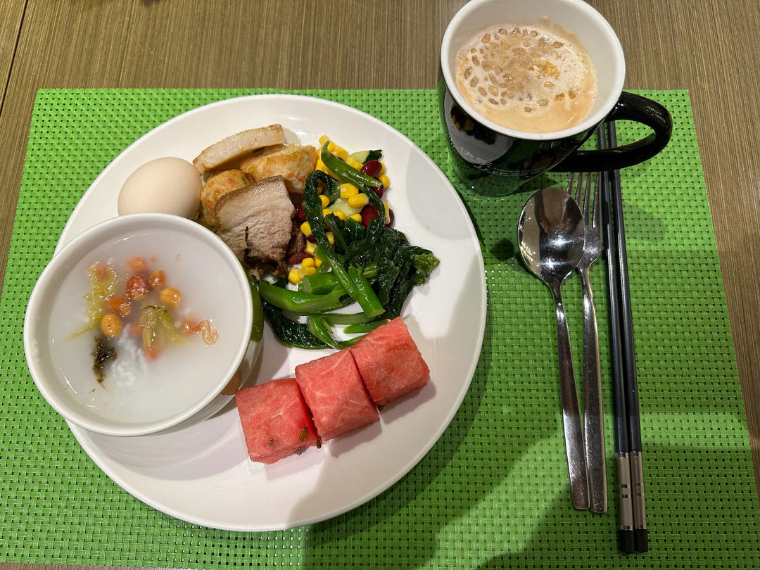 早餐很健康,黑芝麻糊,红薯,鸡蛋,牛肉😋;午餐土豆烧鸡块和米饭🍚;下午茶蛋挞...