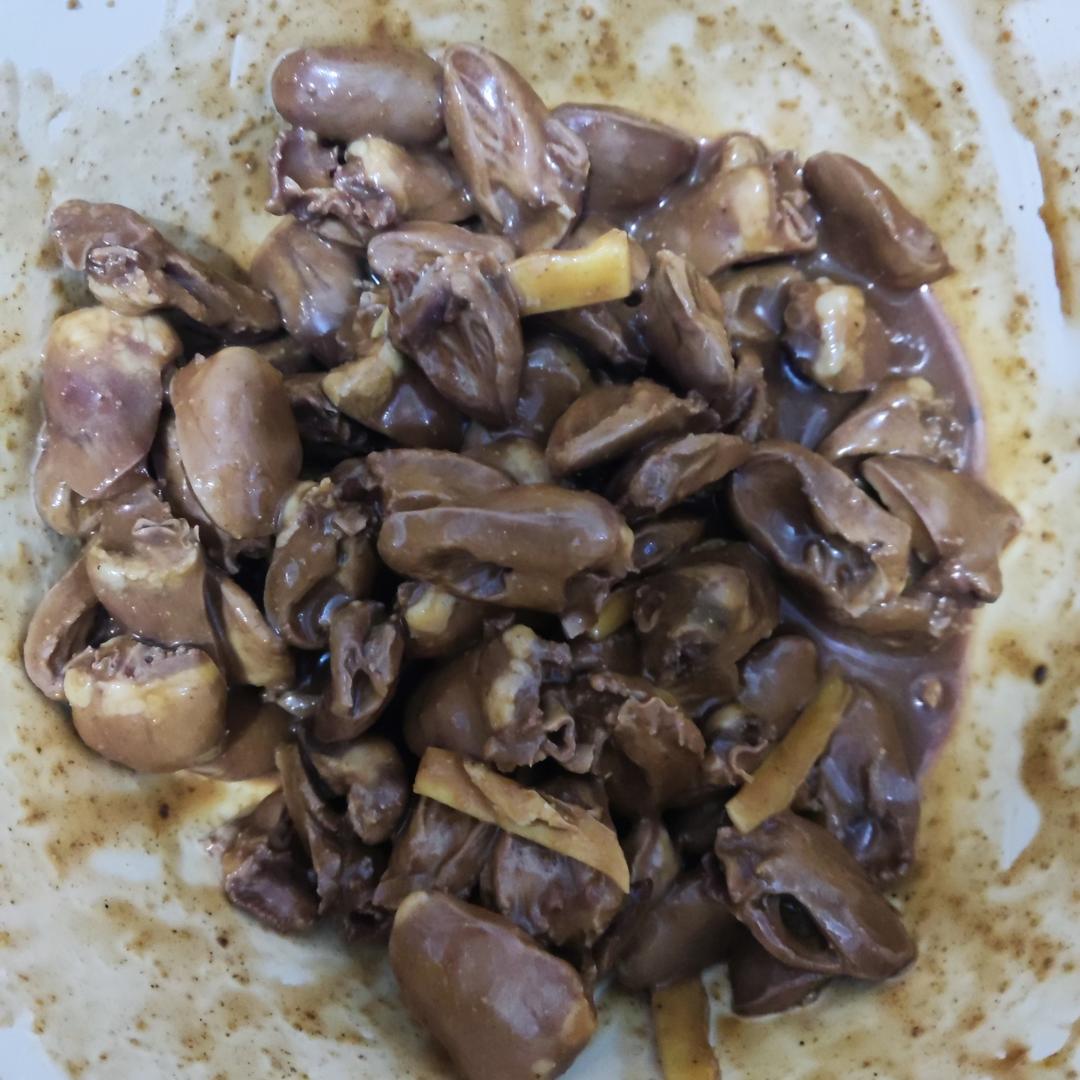 感恩作者分享,这500克鸡心用开水焯了,反正面烤了12分钟,又撒了少许辣椒粉!
