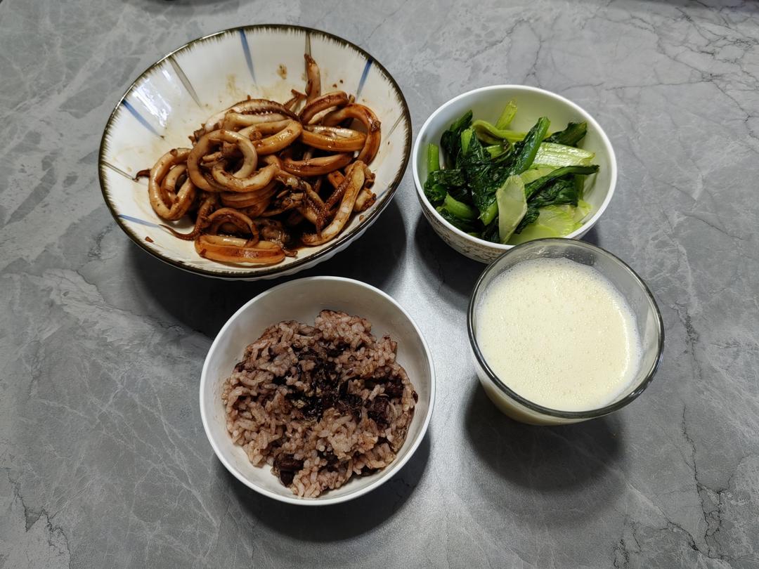 鱿鱼,油麦菜,红豆饭,玉米豆浆