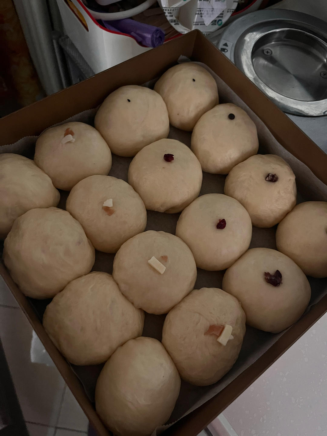 夏天做,水用了冰水,干酵母3.5g,放了一点糖(8g),有糖有助于更上色。面团60g一个,馅料自己做的红豆馅和芋泥馅。2...