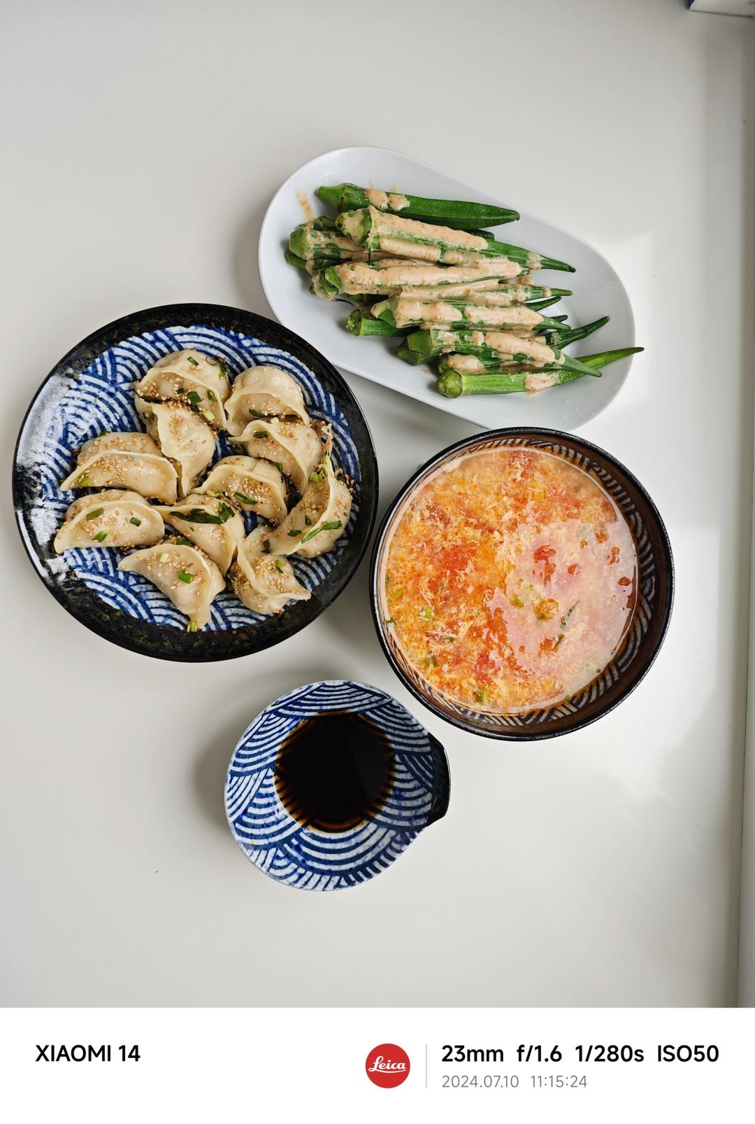 中午偷个懒,之前包好的饺子,煎一下,再烧个番茄蛋汤,煮个秋葵。