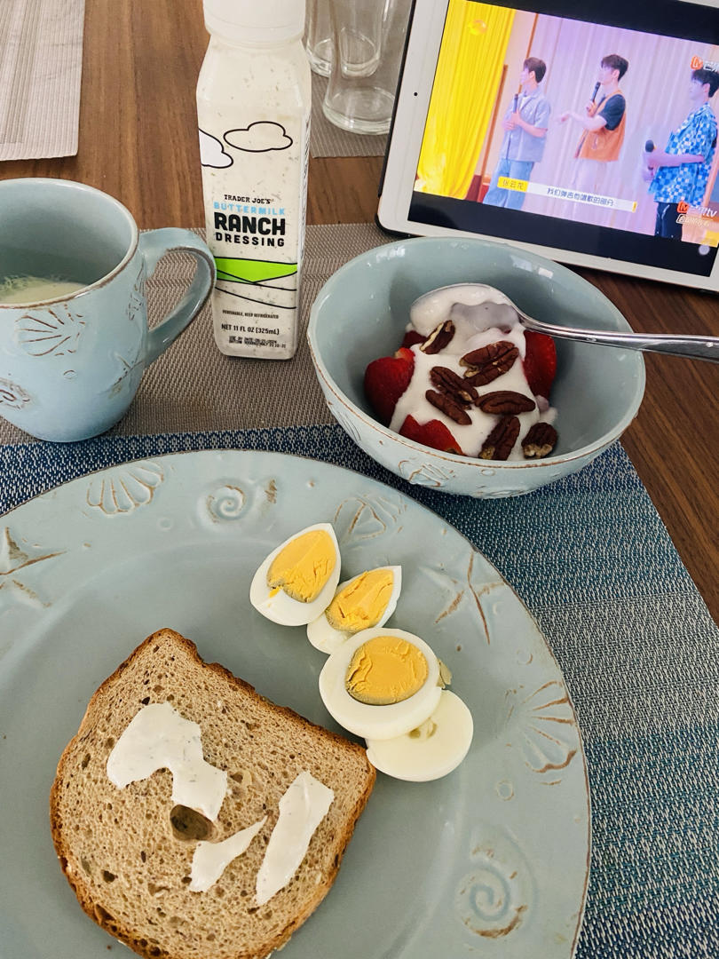 早饭&早范:煎蛋、午餐肉,蓝莓,吐司片,拿铁