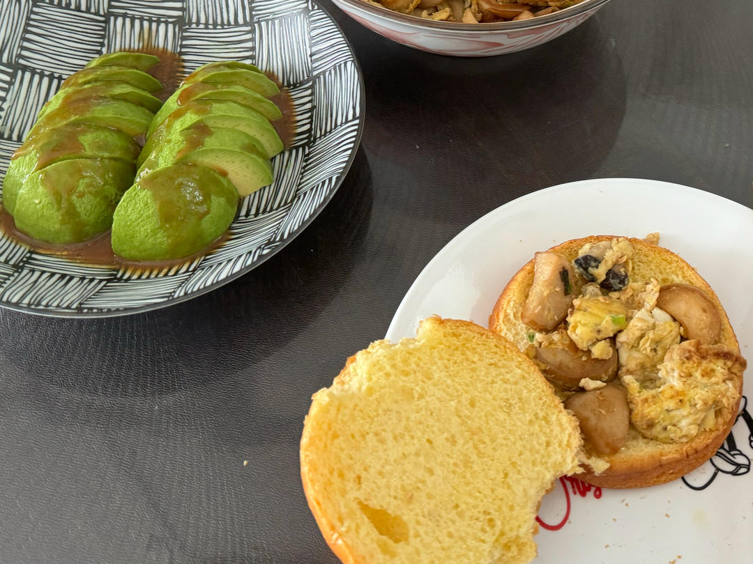 汉堡面包🍔+蘑菇炒鸡蛋🍄🥚+火鸡肉片🥪+和风牛油果🥑