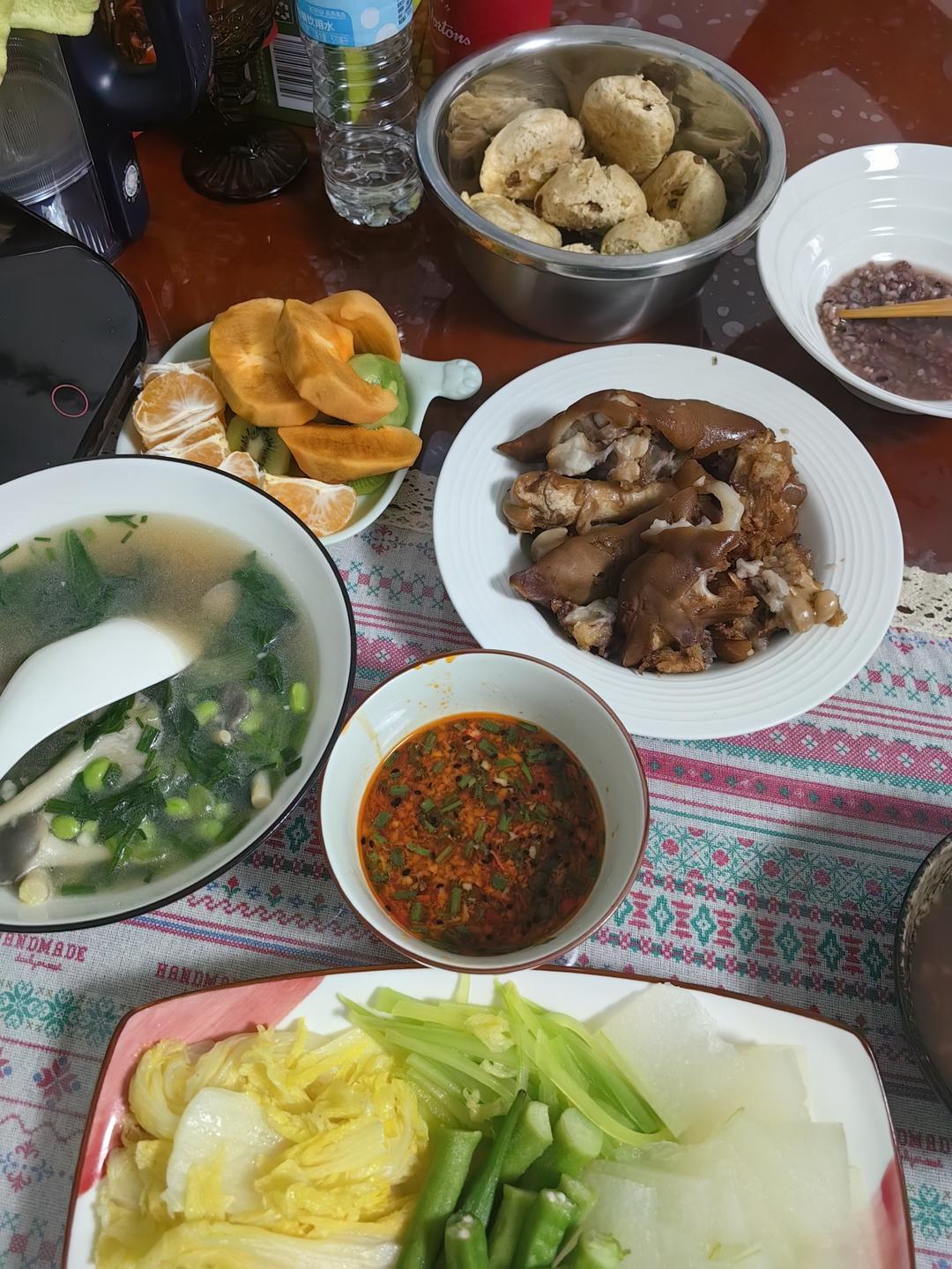 水煮菜(娃娃菜,秋葵,莴笋,冬瓜),毛豆丝瓜白菜汤,卤猪蹄,杂粮粥