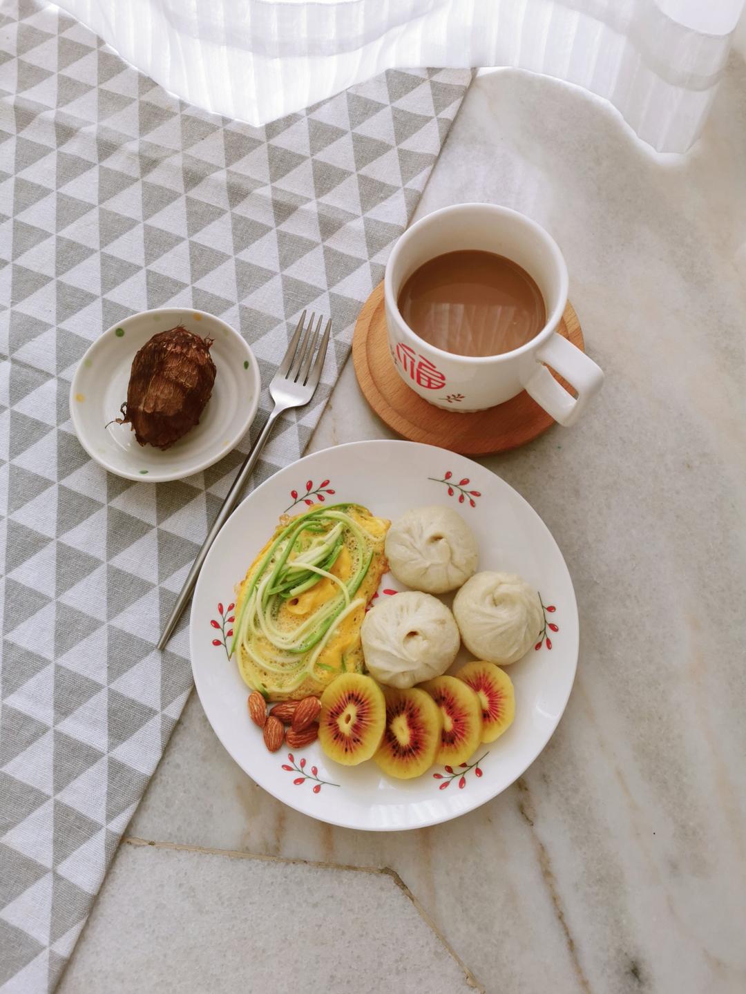 今日早餐:咖啡☕,小芋艿,小笼包,猕猴桃🥝,小瓜滑蛋,几粒杏仁。
