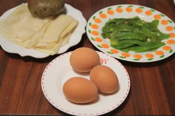 灿烂家早餐 炒荷兰豆+单饼+贝果+白煮蛋,超市买了新鲜的荷兰豆,小妞自己一人光盘~我俩单...