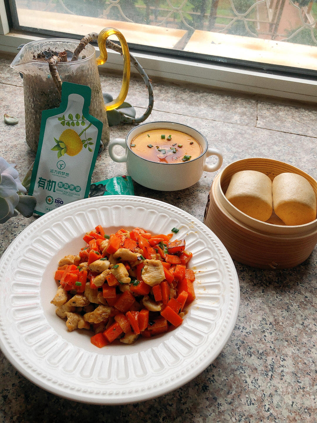 全麦馒头➕鸡蛋羹➕胡萝卜炒鸡胸肉➕刺梨➕黑芝麻丸