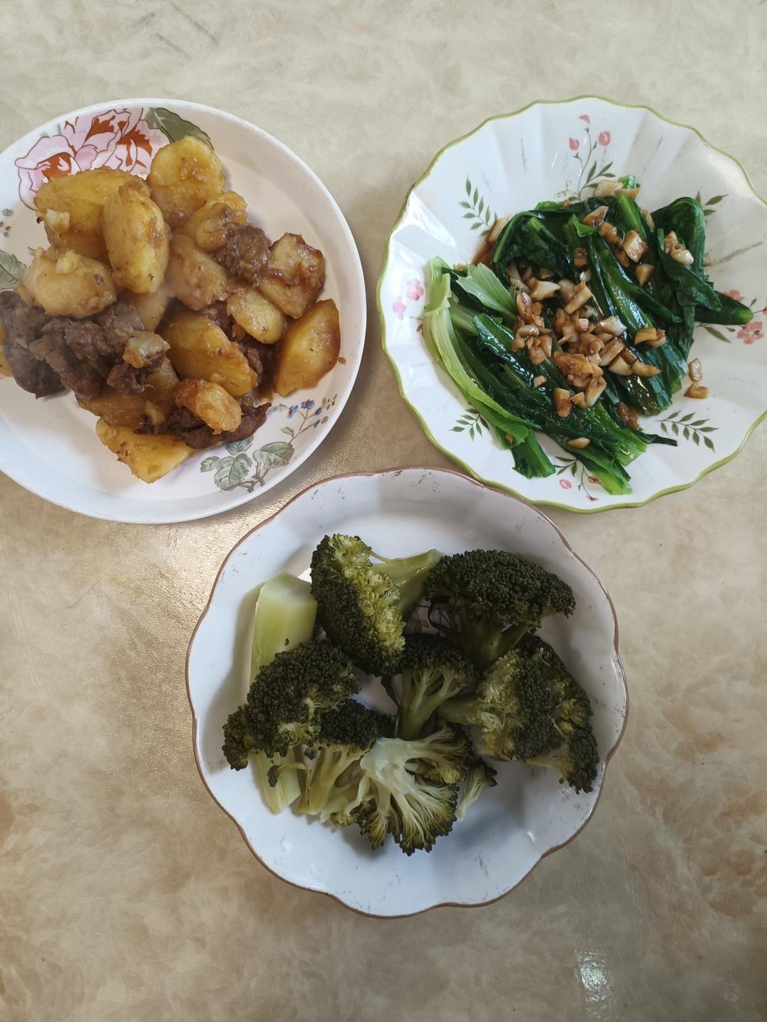 营养小饭桌开饭啦:蒜蓉油麦菜,土豆炖鸡肝,蒸西蓝花,白米饭