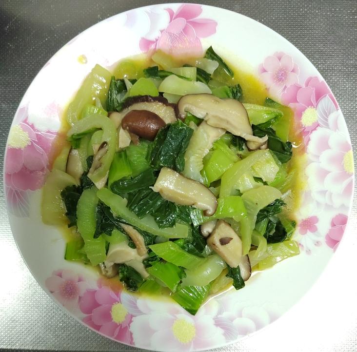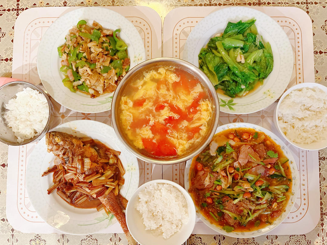 干烧黄鱼,夫妻肺片,蚝油生菜,青椒腊肉炒榆黄蘑和西红柿鸡蛋汤。