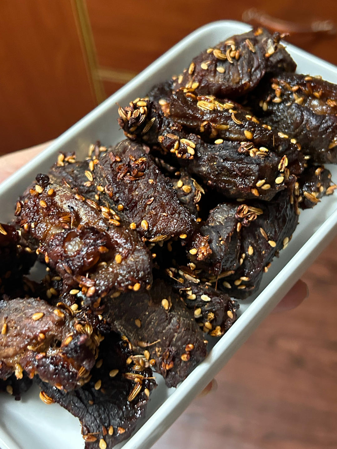 腌了半小时就开烤了,盐确实盐少放些,另外加了烧烤料和一点耗油,没用老抽颜色也很好看,真...