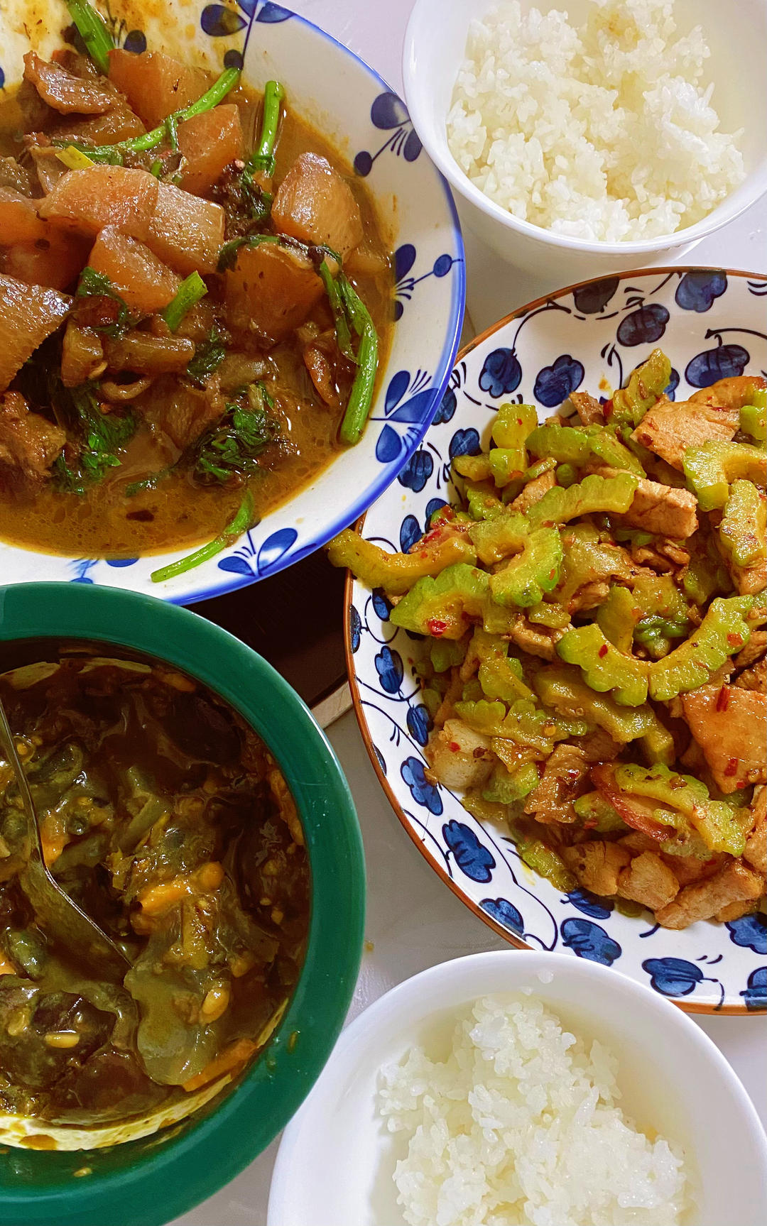 西红柿炖牛肋条,冬瓜白菜汤,家烧冬笋青菜