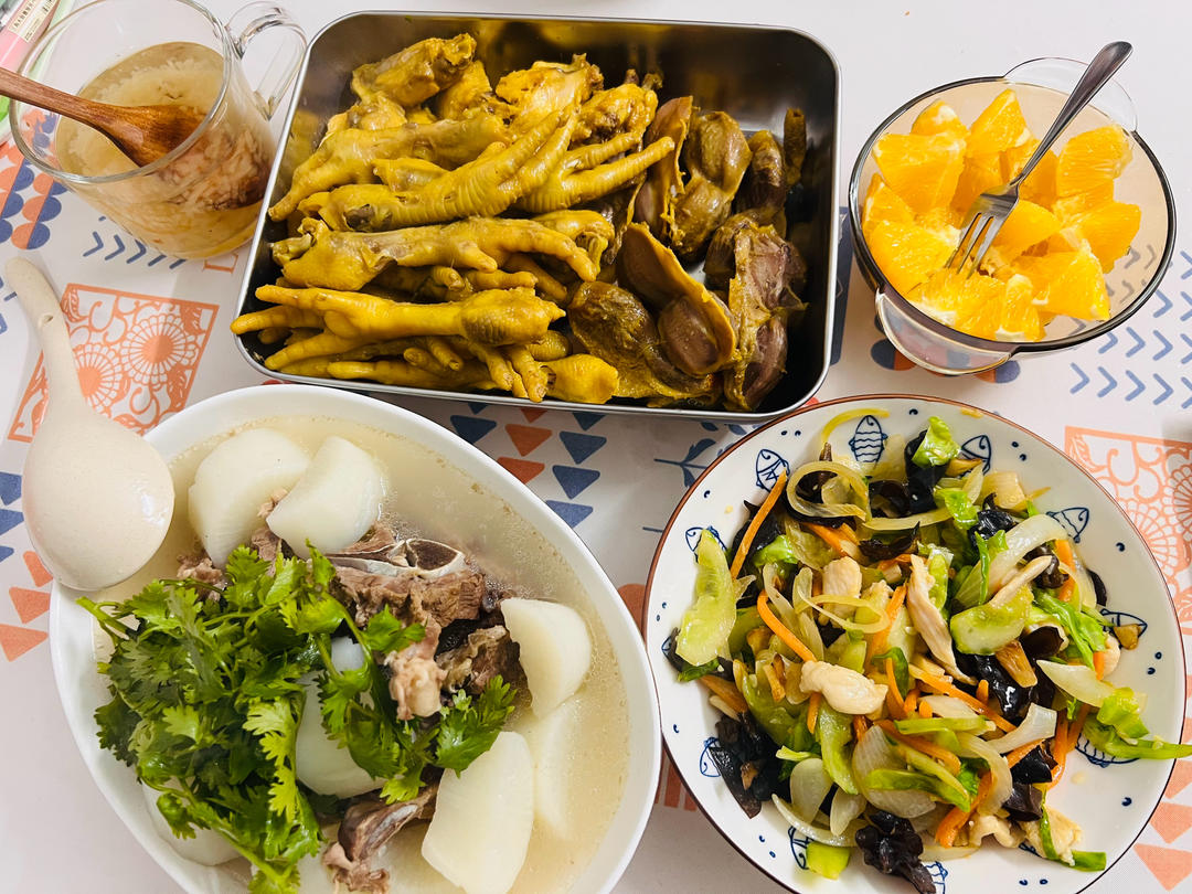 盐焗鸡爪鸡翅鸭胗,清炖羊蝎子白萝卜,鸡肉丝炒杂蔬,雪梨银耳汤,脐橙