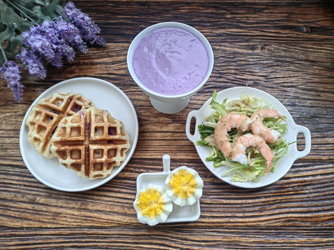 紫薯牛奶🥛+华夫饼🧇+水煮蛋🥚+虾仁苦菊🍤