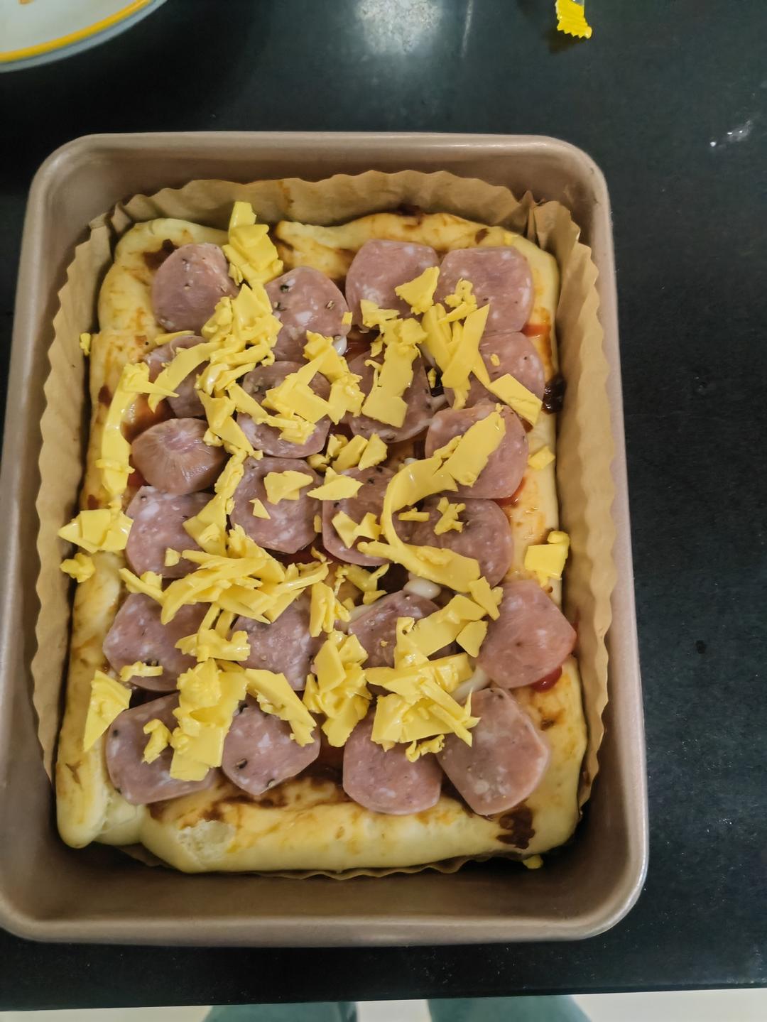 孩子临时起意要吃榴莲披萨🍕,没有芝士碎用的芝士片,口感略偏咸,好在榴莲肉铺的多,比买的好吃