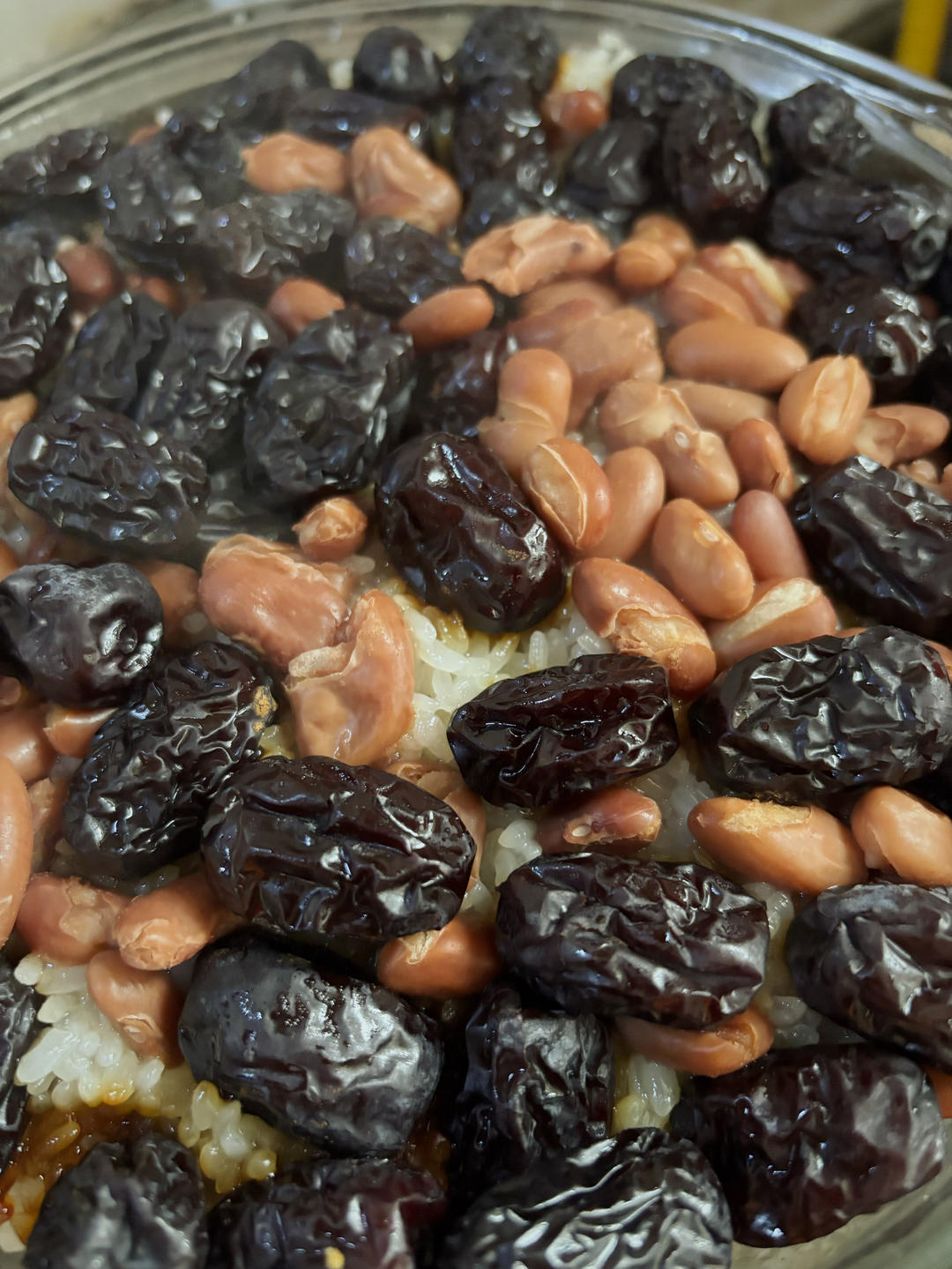 这个需要隔水蒸制六个小时,用的是一个微波炉专用的玻璃碗,底层是枣,然...