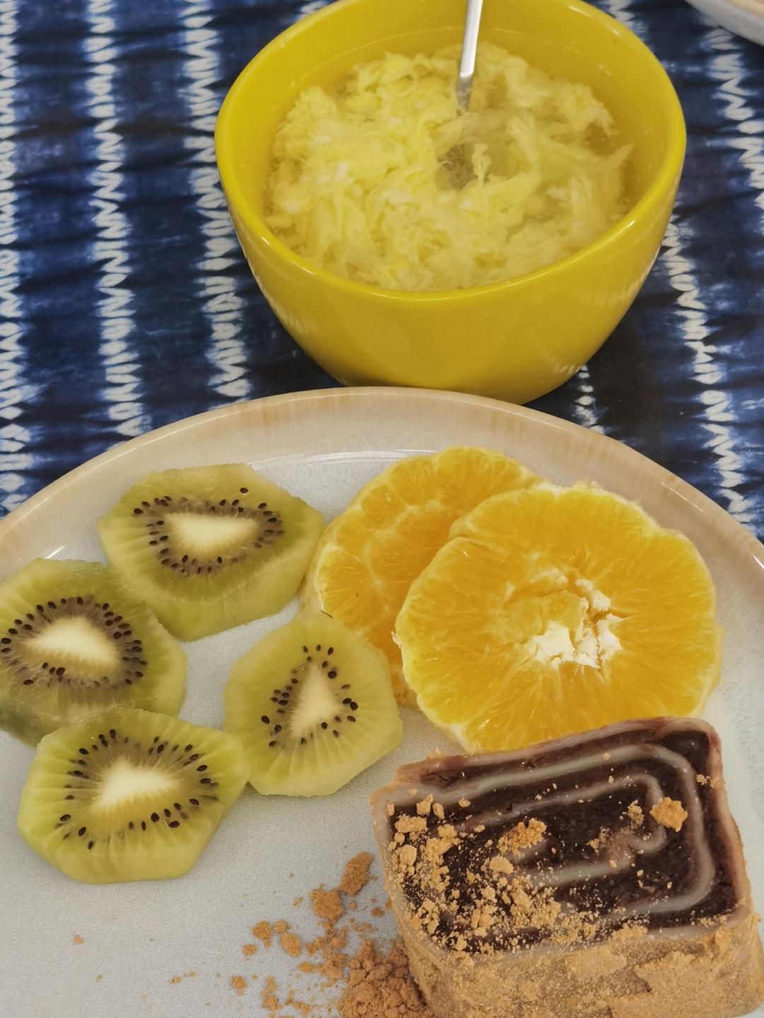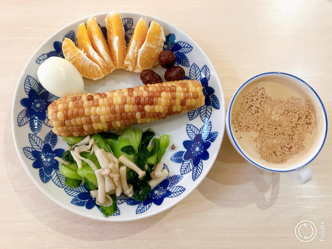 昨天晚上放纵的吃了一餐,今天吃点清淡的吧:玉米,蔬菜➕水果,鸡蛋,红枣,肉桂咖啡。