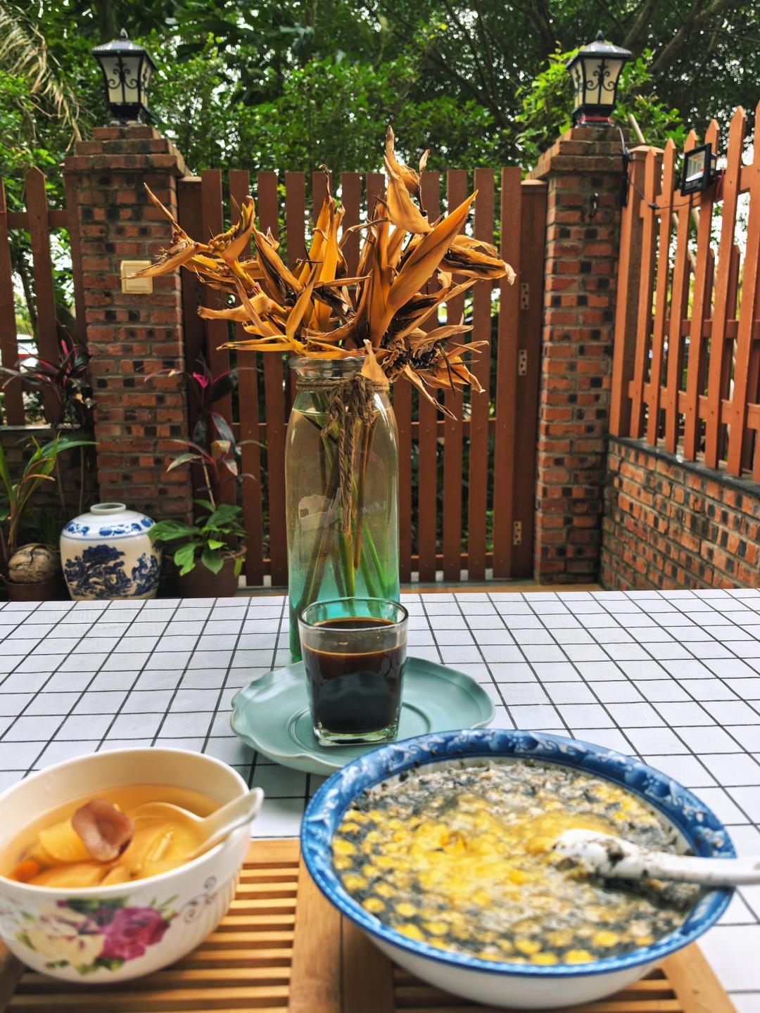 【早餐心语】一碗温润的黑芝麻玉米鸡蛋燕麦粥,粗粮与鸡蛋和芝麻的香气质朴醇厚。黑咖啡的清醒时光,苦涩里沉淀着提神的力道,恰...