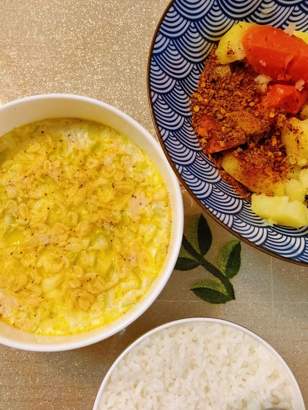 🦐🥔🥗竹荪土鸡汤、花螺、炸虾,还有一个无敌好吃的土豆泥沙拉(土豆泥加飞鱼籽、酸黄瓜、玉米粒、虾切小段、鸡汤、凯撒沙拉酱、...