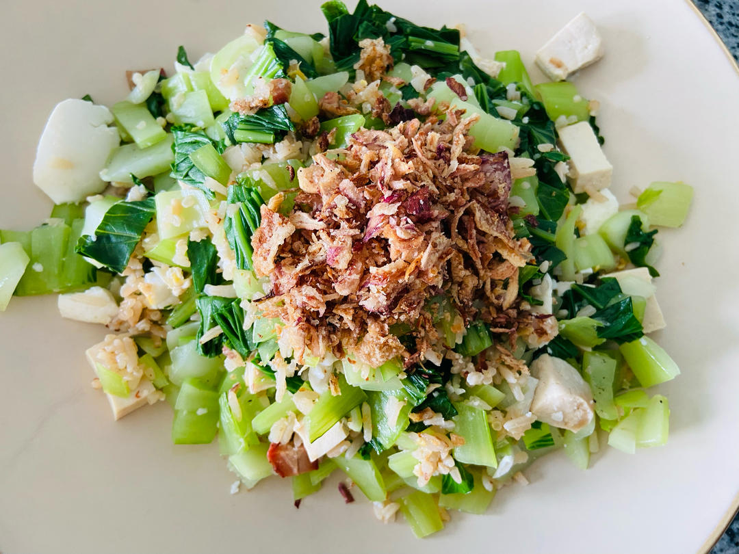 青菜炒豆腐鹹蛋配炸洋蔥碎,雞肉炒飯(昨日打包的)。