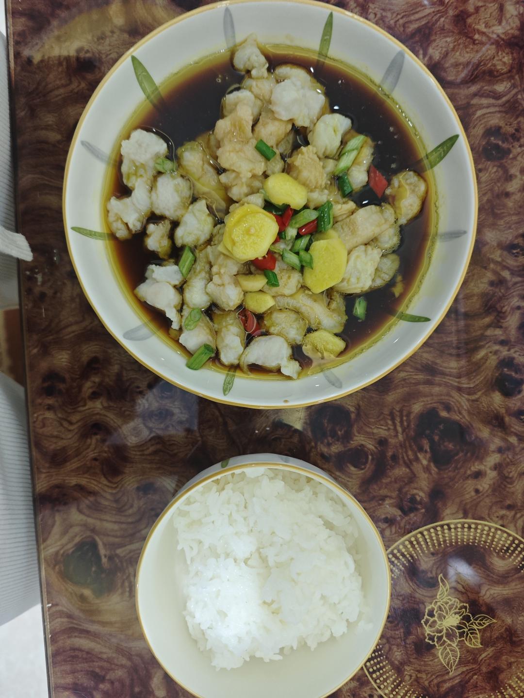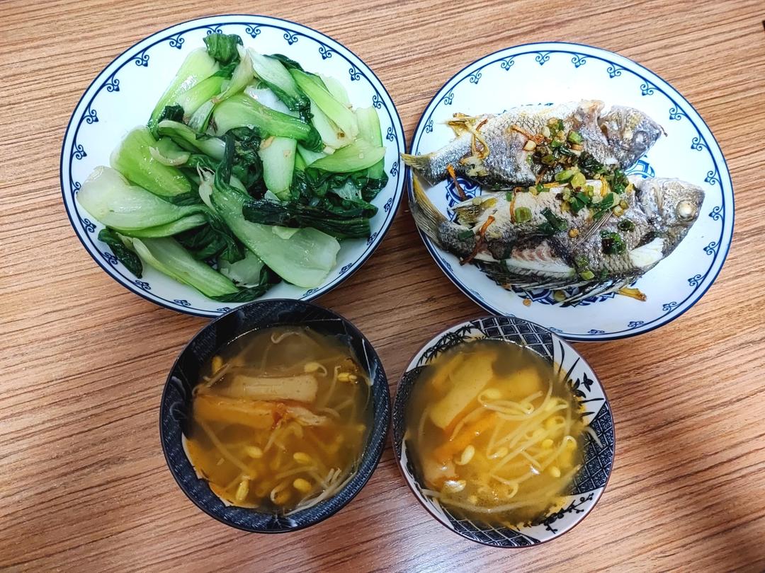 干煎黄立鱼,蒜蓉油菜,韩式豆芽汤