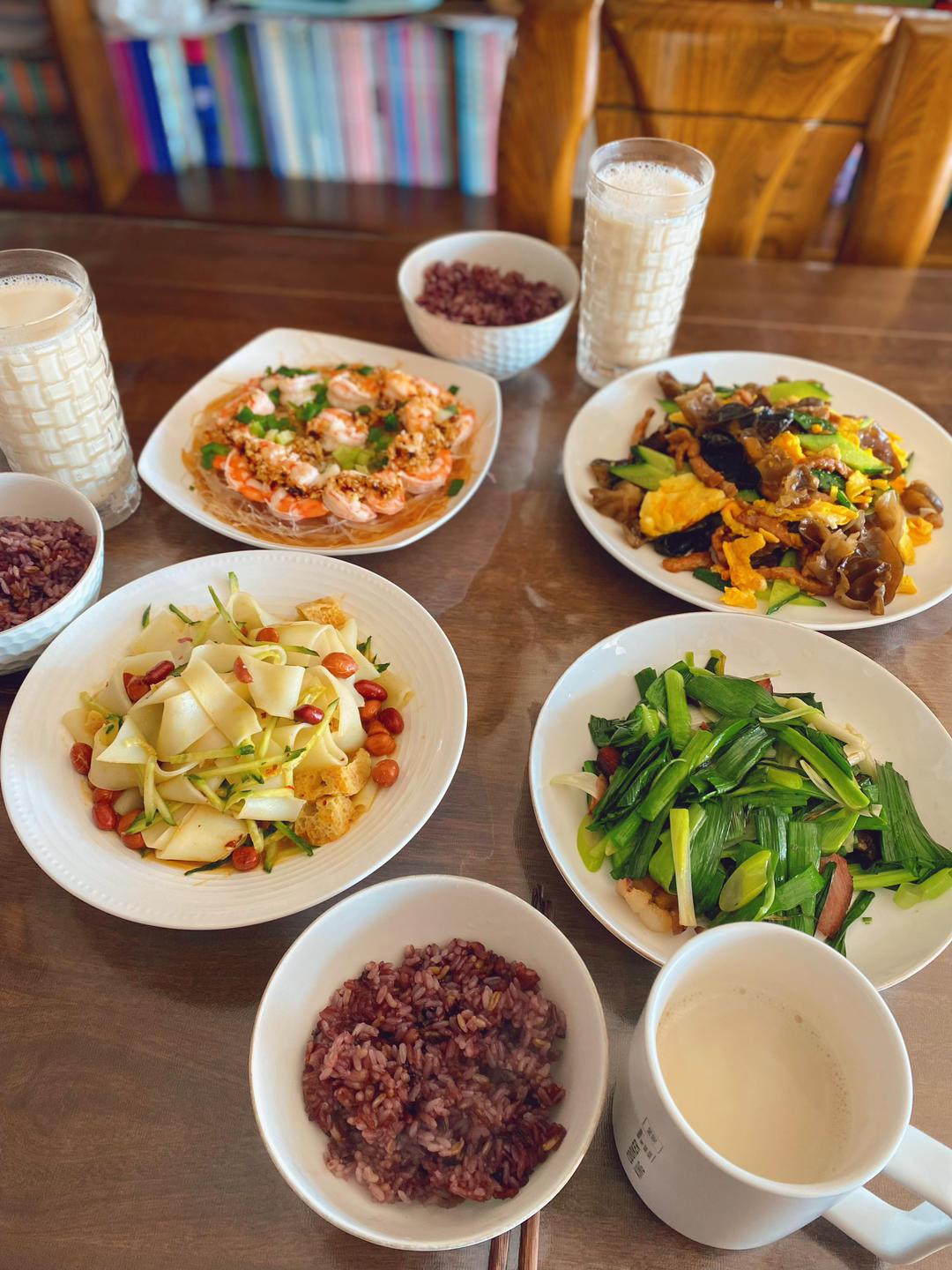 🎈午餐:蒜蓉粉丝虾🦐,木须肉,蒜苗炒腊肉,麻酱凉皮,主食杂粮米饭