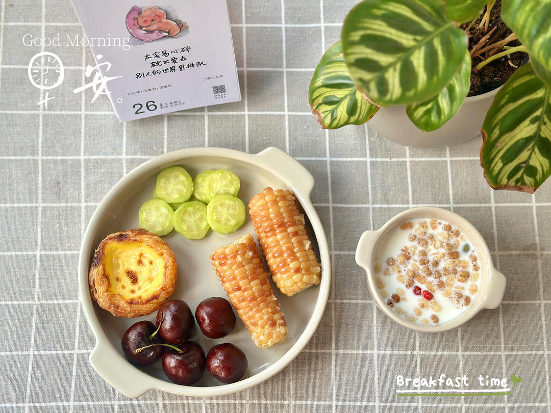 蛋挞+玉米🌽+黄瓜🥒+车厘子🍒+牛奶麦片