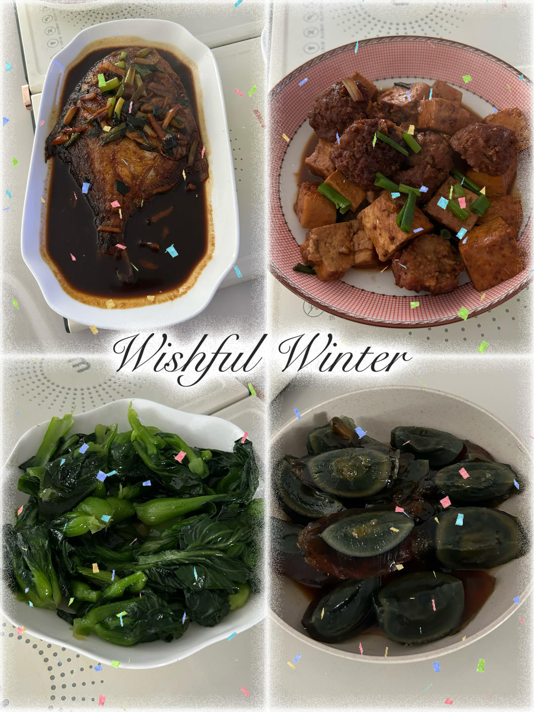 醋溜鲳鱼,肉圆豆腐,清炒菜苔,凉拌皮蛋。