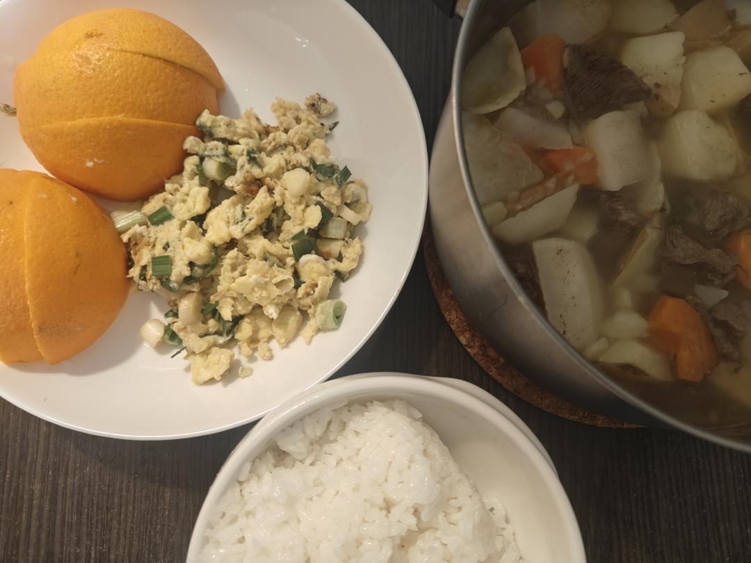 小葱炒蛋+炖土豆牛肉胡萝卜白萝卜