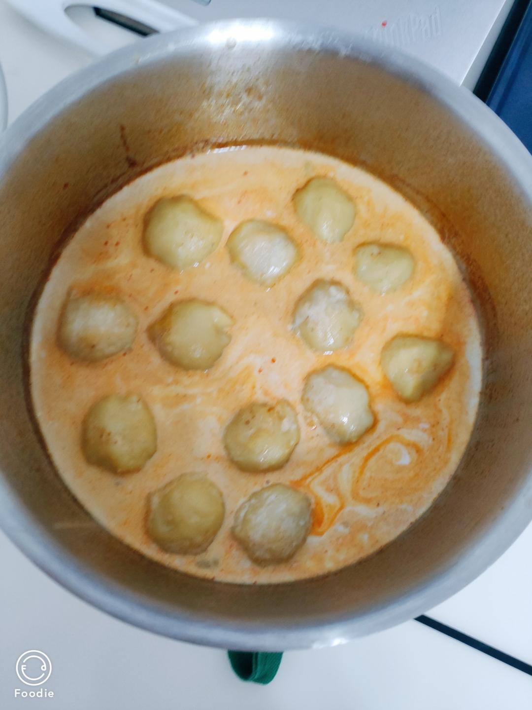 咖喱鱼丸(这次加了椰浆,椰浆甜甜的真好喝啊) 几勺李锦记的咖喱酱,非常好吃,下次水可以少放...