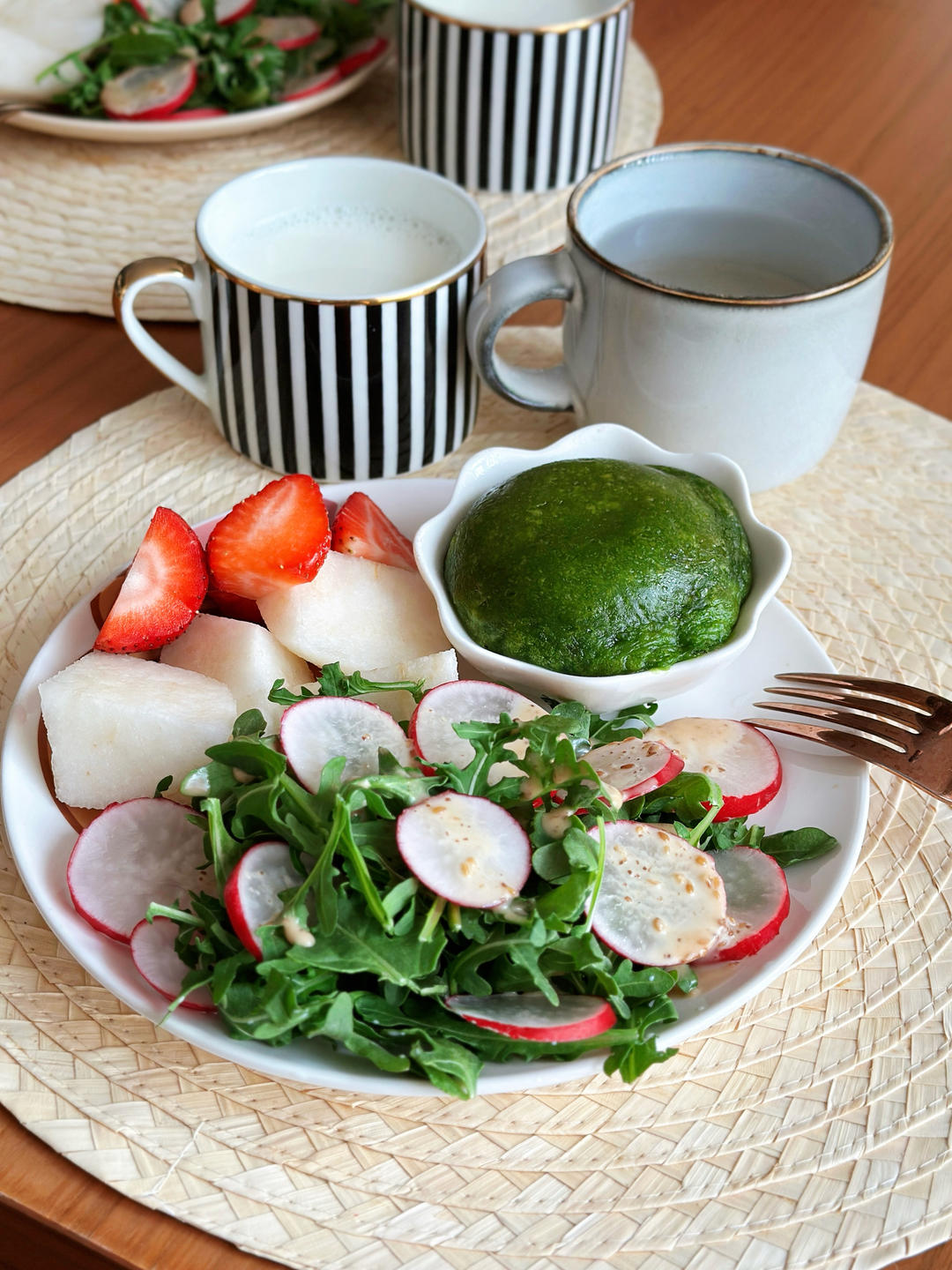 梨 草莓 芝麻菜樱桃萝卜沙拉 牛奶 豆沙馅青团