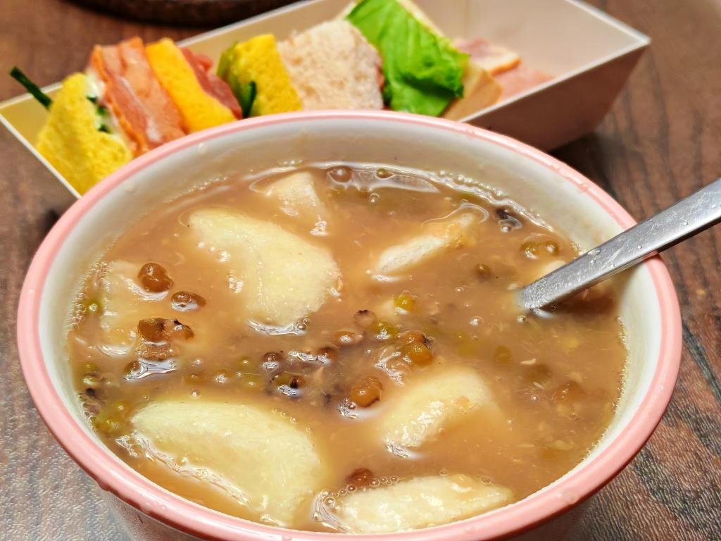 今天就简单吃 放了水果的绿豆粥