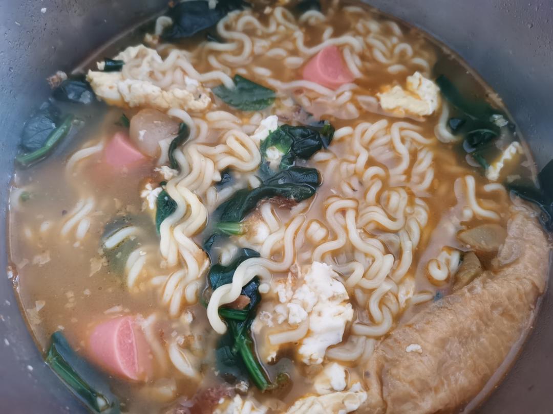 方便面: 煎蛋 菠菜 火腿肠 响铃卷 榨菜