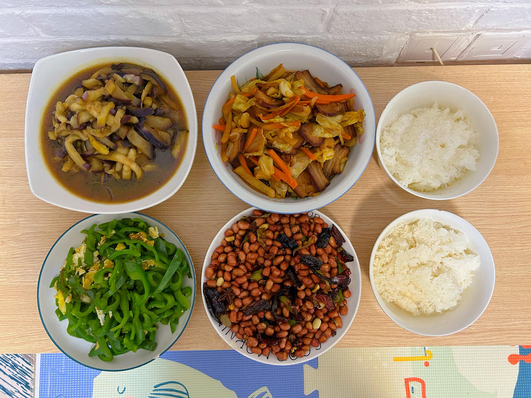 清炒茄子,腊肉炒酸泡菜,青椒炒鸡蛋,油炸花生米。