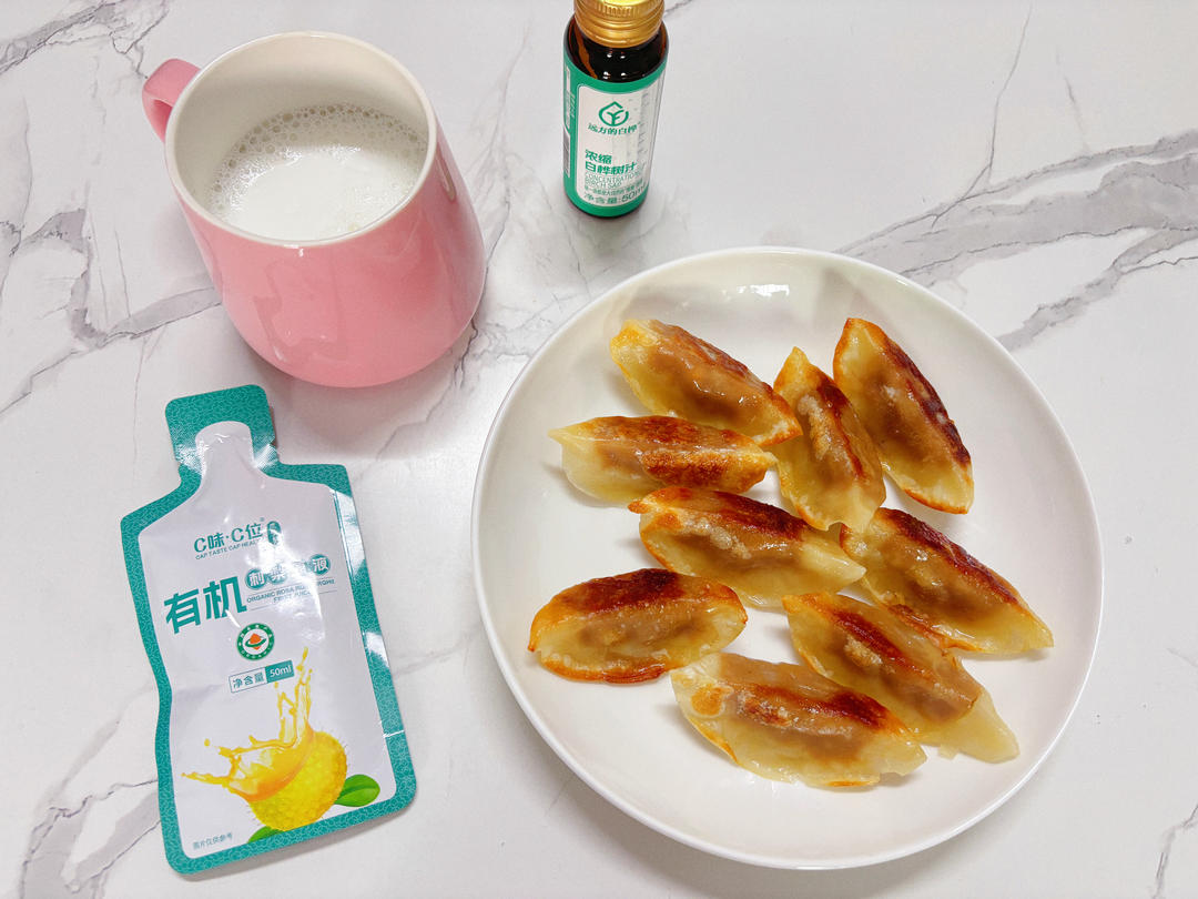 煎了姐姐爱吃的煎饺,皮脆肉香,还冲了高营养的驼奶,姐姐最爱喝的奶。