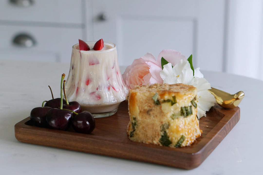 今天没有酸奶水果碗,因为酸奶吃完了还没有时间去补货,李子奶白酒配葱香肉松面包,感谢@