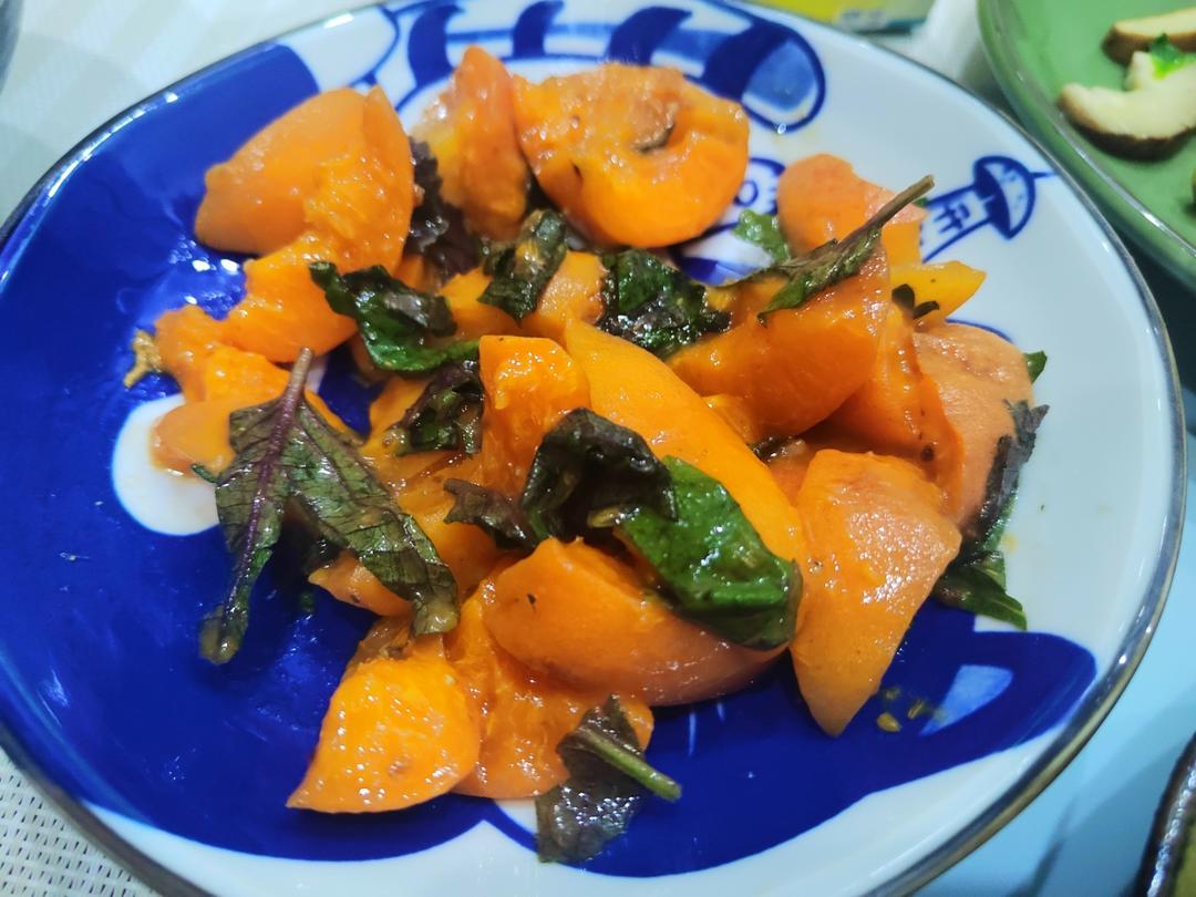 紫苏拌杏 弟弟从山上摘来的杏,用自己种在花盆里紫苏,撒点柠檬调味盐,少许白糖,凉拌一下,...