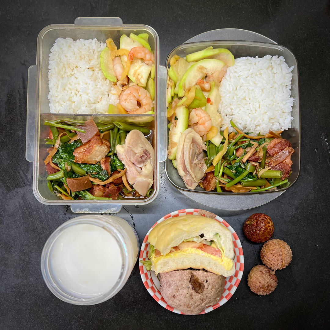 昨天妈妈食堂打包的两个荤菜,笋干烧肉有点油正好今早二次加工一下,炒空心菜都不用放油了🤣~咸鸡的汤汁冷藏后成了冻卤,用来炒...