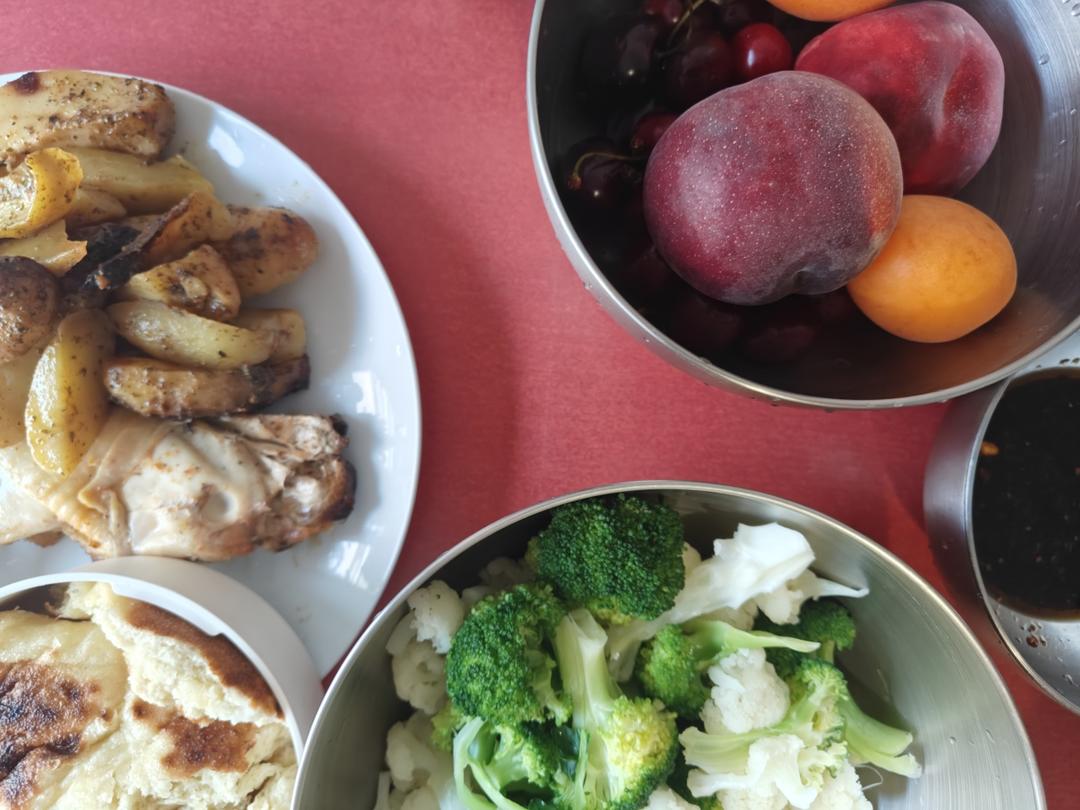 超市买的烤鸡腿土豆+水煮西兰花菜花蘸油辣子酱油香油柚子醋