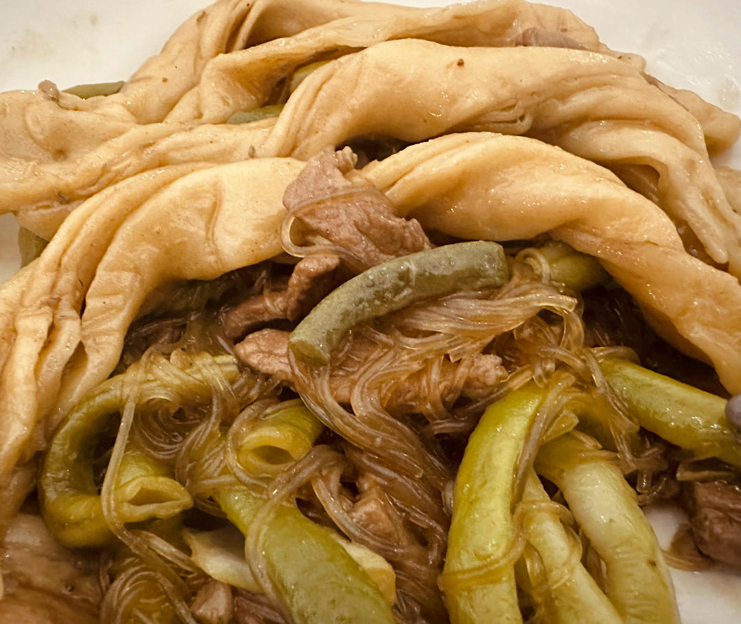肥牛培根日式炒乌冬。除了罗宋汤里的卷心菜其余的某仁一概不吃,他那份已经是肉多菜少了,以为浓油赤酱能混过去,结果就是整整齐...