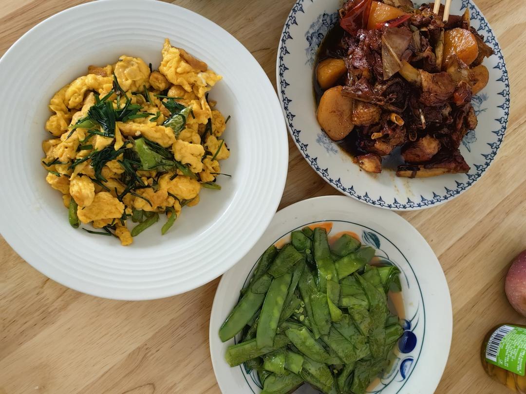 昨天中午的土豆烧鸡,素炒荷兰豆,炒蛋