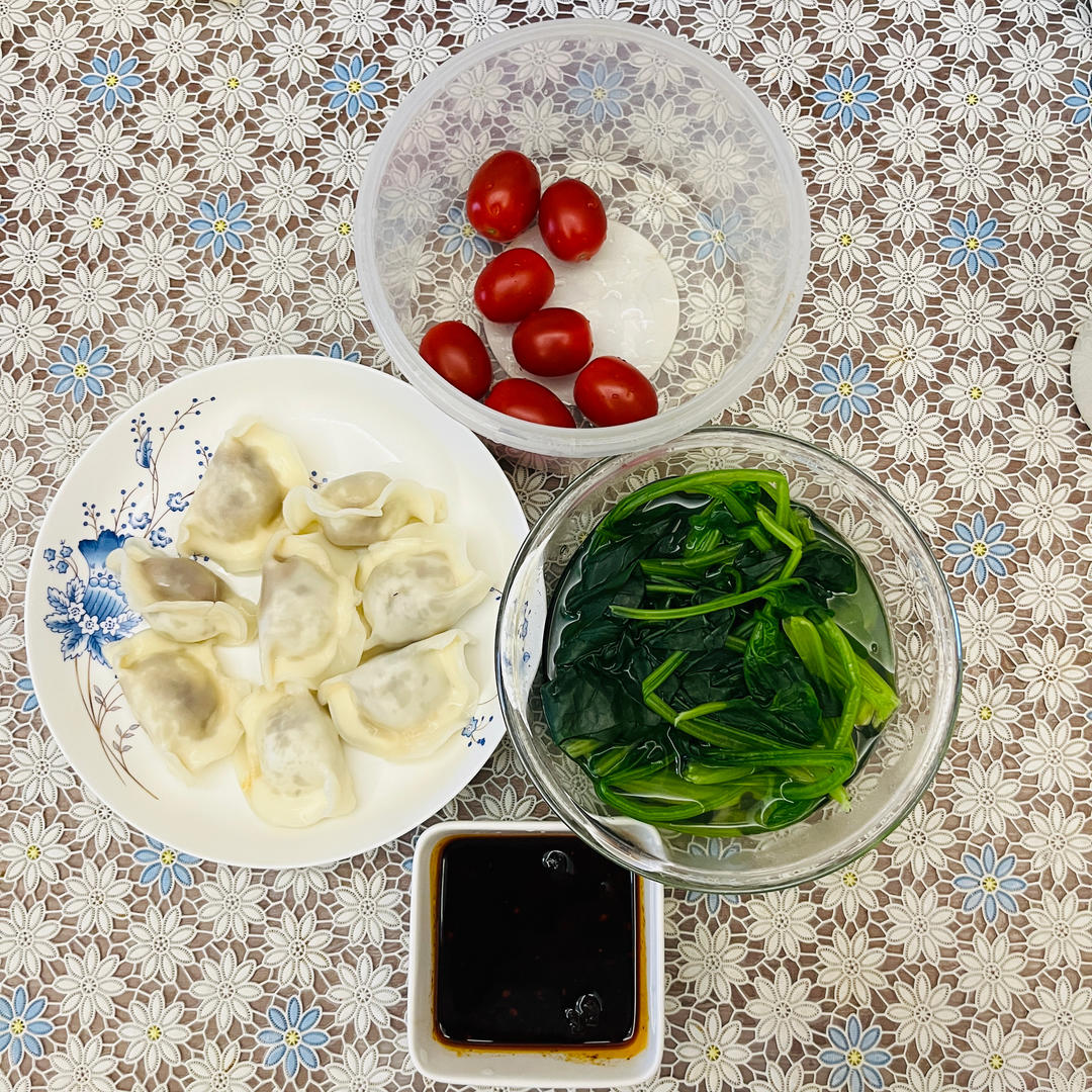 周内好久没在家做晚饭吃了。速冻饺子➕菠菜➕千禧果
