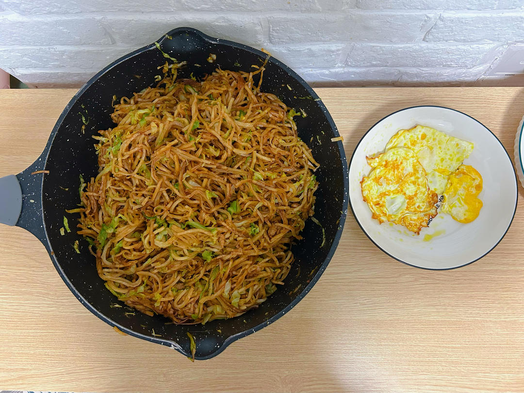 肉丝炒饼,煎蛋。