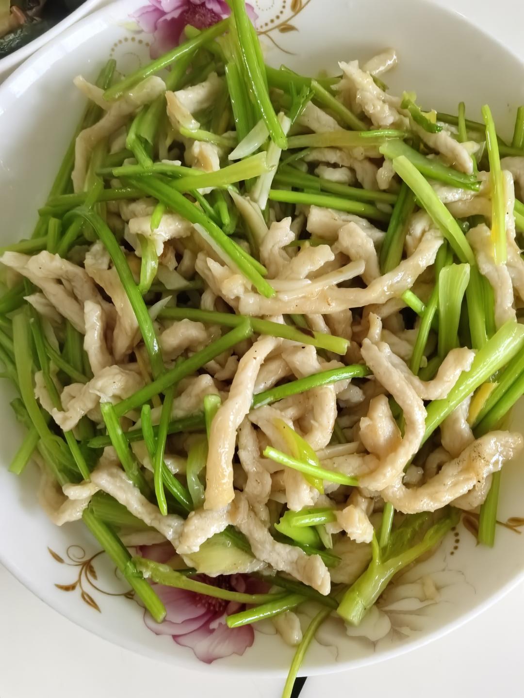 芫爆肉丝,雪白翠绿