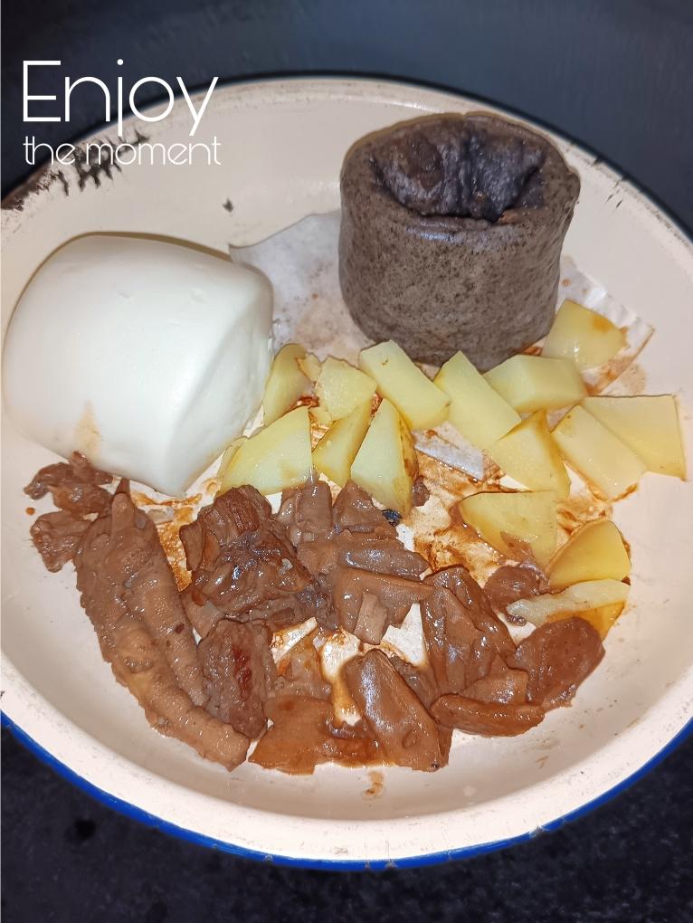 白馒头、芝麻馒头、土豆🥔、莲藕焖排骨、鸡脚、2个核桃。