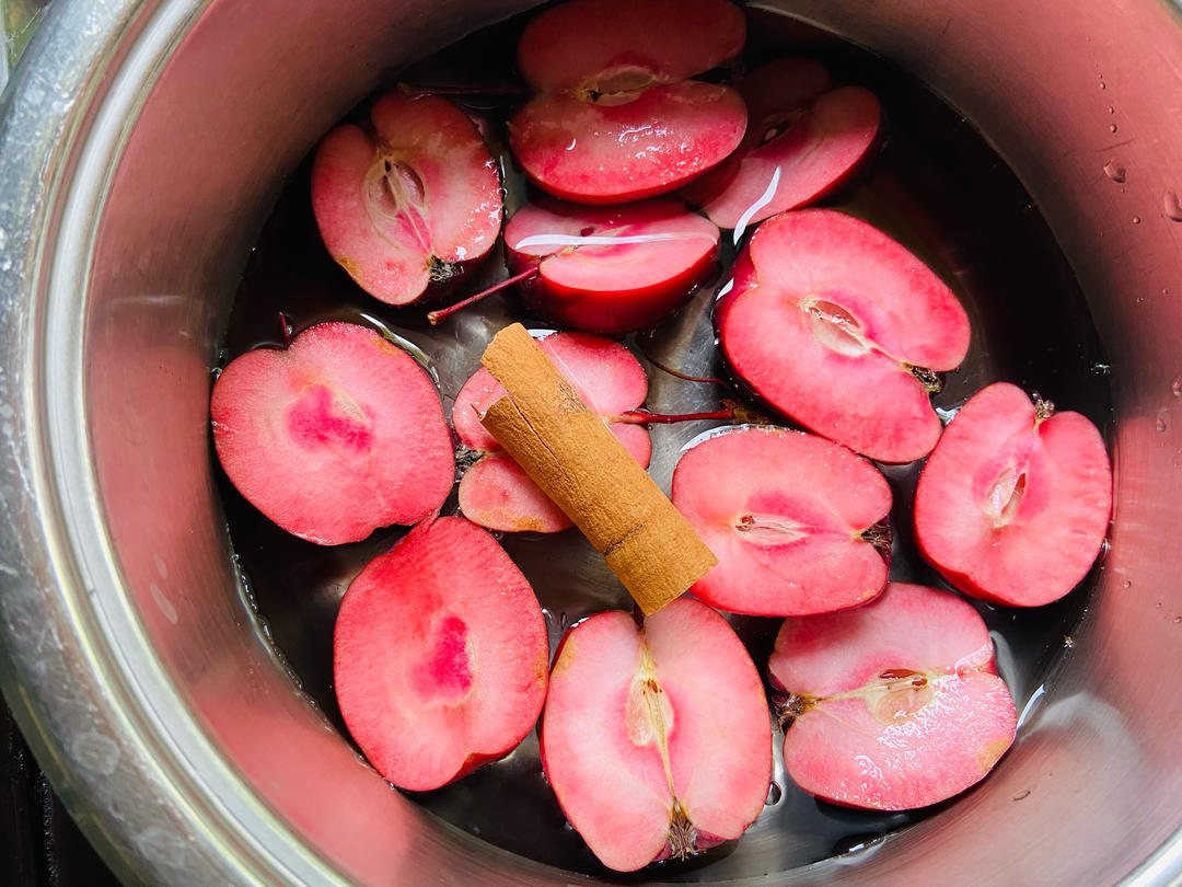 今天用紅果海棠煮水喝,顏值和味道都很棒!酒釀好像出了一點酒,再等兩天。