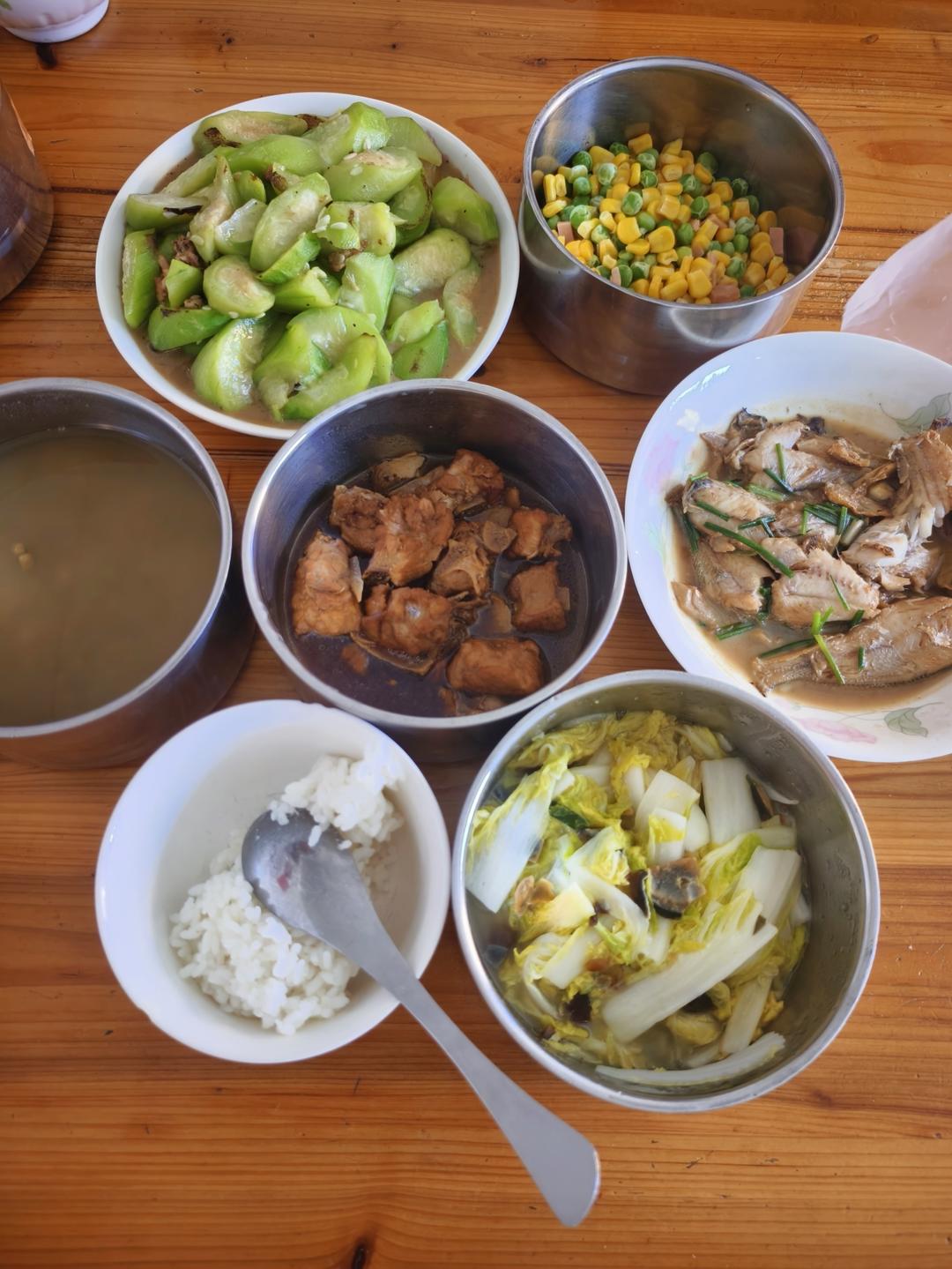 蒸酿双拼,炒丝瓜,蒸烟薯,番茄蛋,炒生菜,陕西火晶柿子和山西流心蜜柿子