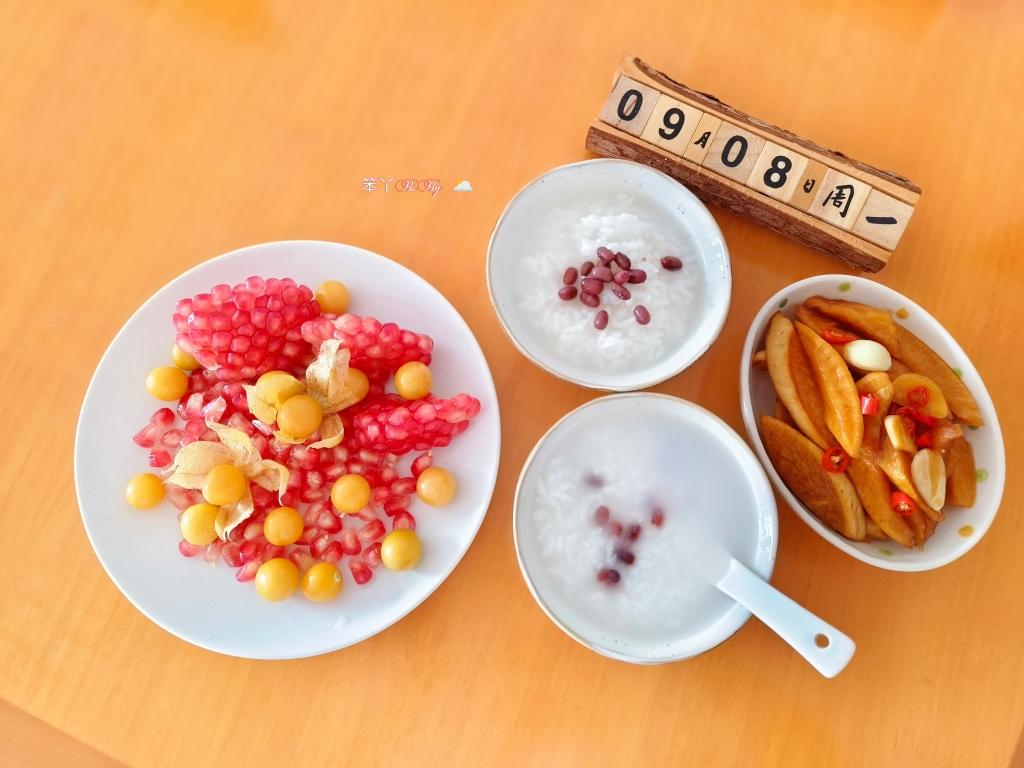 今日简单的早餐:白米粥,酱萝卜条,水果