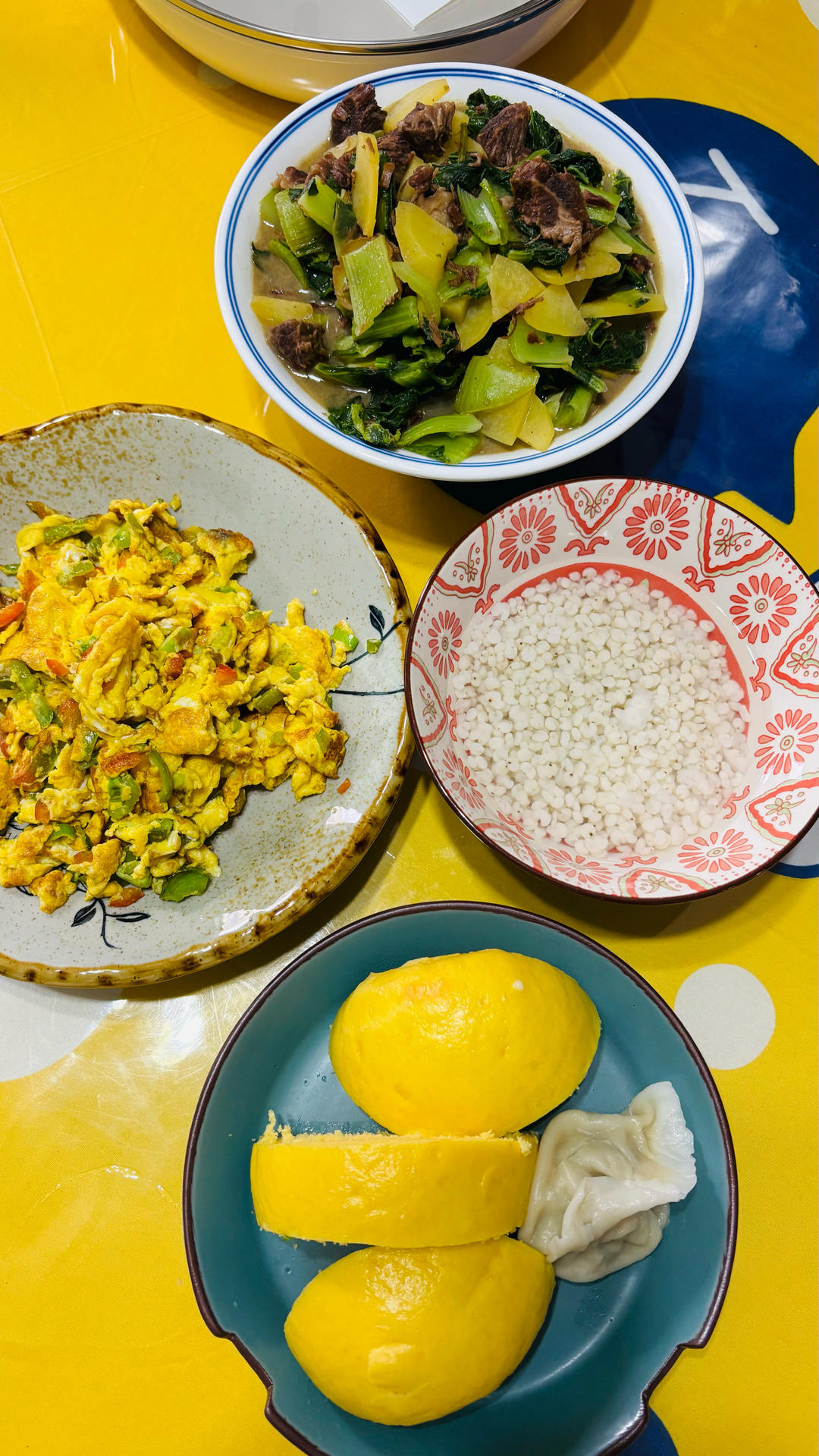 口蘑小白菜,腌制牛肉,藜麦饭,紫菜汤
